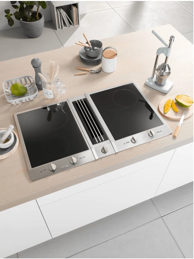 במרכז המשטח משולבת מערכת שאיבת אדים חזקה (Cooktop extractor) שמושכת את האדים ישירות כלפי מטה, במקום קולט אדים עליון, ליצירת מטבח נקי ומודרני.