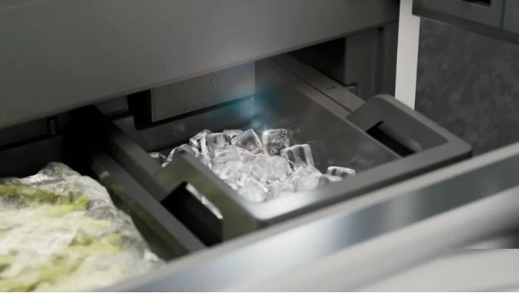 IceMaker מובנה עם חיבור ישיר למים – מייצר עד 1.5 ק"ג קוביות קרח ביום, עם מחיצה מתכווננת לאחסון נוח.